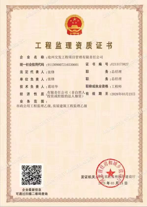 2023年3月24日,經河北省住房和城鄉建設廳核準,滄州交發工程項目管理有限責任公司獲批市政公用、房屋建築工程監理乙級資質證書。
