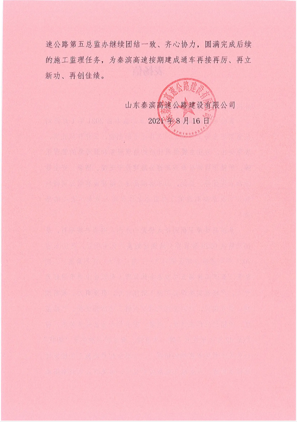 監理中心穩步推進秦濱高速漳衛新河建設項目,獲秦濱高速建設有限公司感謝表揚