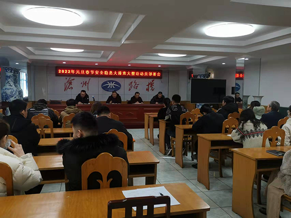 2021年12月30日下午14:30,路橋公司安委會組織召開2022年元旦春節安全隱患大排查大整治動員部署會,會上曹豔明總經理傳達了集團下發的關於疫情防控、安全風險隱患大排查大整治等文件精神,部署了《滄州路橋工程公司安委會2022年元旦春節期間安全生產風險隱患大排查大整治行動方案》,要求各部門、子(分)公gong司si積ji極ji落luo實shi相xiang關guan責ze任ren,嚴yan格ge按an行xing動dong方fang案an中zhong實shi施shi步bu驟zhou完wan成cheng各ge階jie段duan任ren務wu目mu標biao,杜du絕jue各ge類lei生sheng產chan安an全quan事shi故gu發fa生sheng。同tong時shi,還hai應ying提ti高gao政zheng治zhi站zhan位wei,進jin一yi步bu做zuo好hao雙shuang節jie期qi間jian疫yi情qing防fang控kong工gong作zuo,規gui範fan來lai訪fang人ren員yuan掃sao碼ma登deng記ji、嚴格執行“領導帶班、雙人雙崗”值班製度,確保2022年元旦、春節、省市“兩會”、冬奧會、冬殘奧會和全國“兩會”期間公司安全生產形勢穩定。