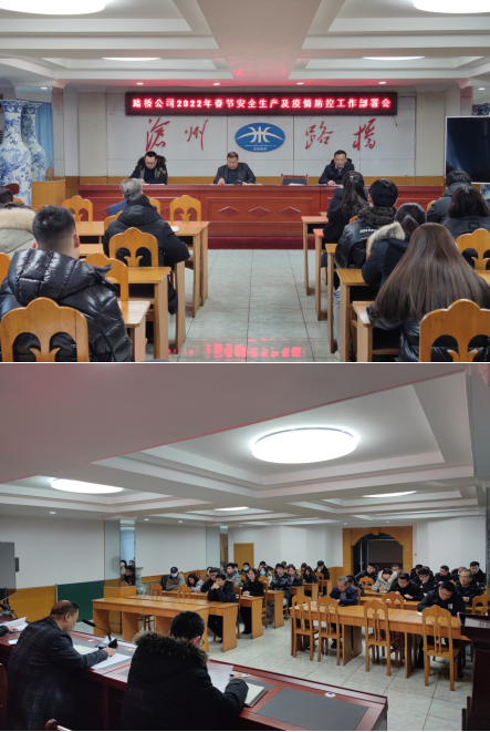 為全麵做好2022年春節、“兩奧會”、“兩會”期間安全生產工作和疫情防控工作,1月28日上午,滄州路橋工程有限責任公司召開安全生產工作及疫情防控部署會,曹豔明董事長首先組織學習了河北省高級人民法院、河北省人民檢察院、河北省公安廳《關於依法從嚴查處妨害疫情防控違法犯罪行為的通告》,要求全體員工切實提高思想站位,遵守通告要求,履行疫情防控責任,隨後傳達了《全市“迎冬奧保春節兩會”安全生產攻堅行動方案》、《河北省環境信息依法披露製度改革實施方案》、集團《關於做好2022年春運和冬奧會期間安全保暢和疫情防控工作的通知》及《滄州路橋工程有限責任公司2022年春節期間安全生產和疫情防控工作部署》。