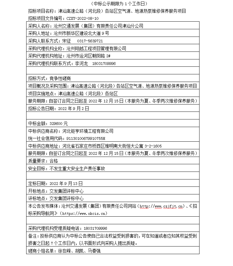 津汕高速公路(河北段)各站區空氣源、地源熱泵維修保養服務項目中標公告