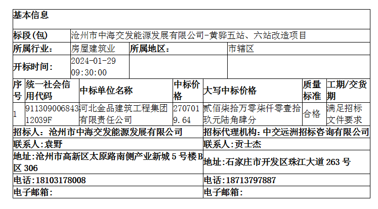 滄州市中海交發能源發展有限公司-黃驊五站、六站改造項目中標公告