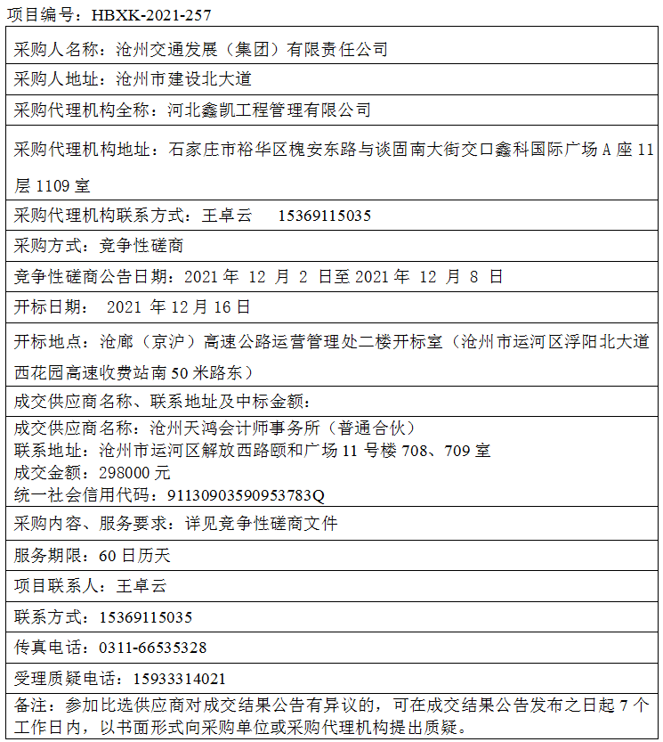 滄州交通發展(集團)有限責任公司 2021年度財務及內部控製和風險控製審計項目 成交結果公告