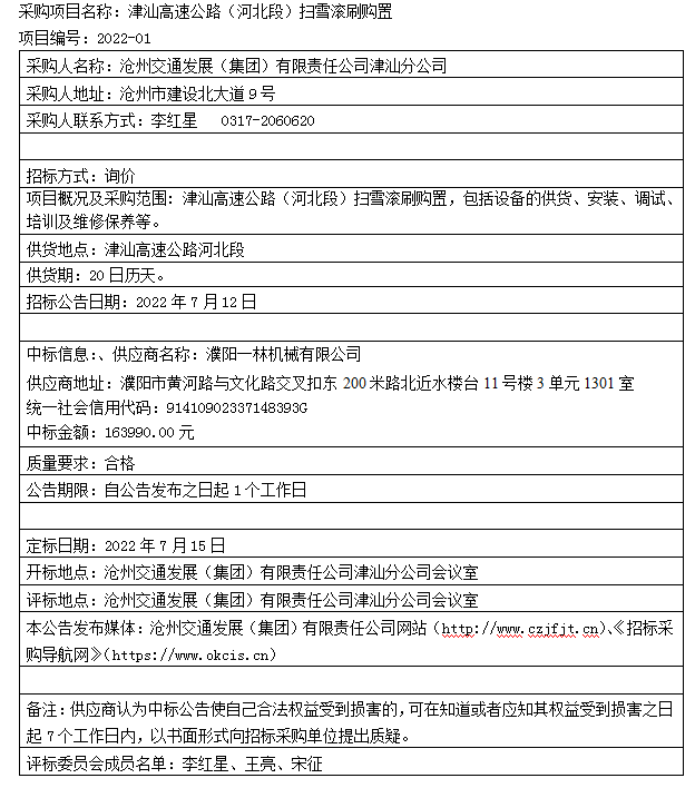 津汕高速公路(河北段)掃雪滾刷購置中標公告