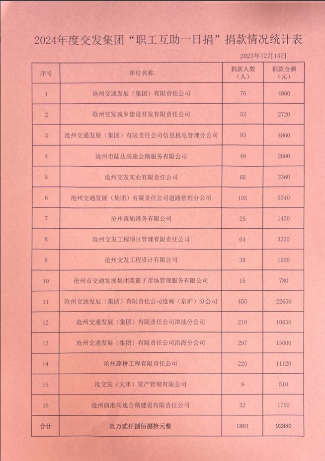 開展“職工互助一日捐”活huo動dong,是shi全quan市shi各ge級ji工gong會hui組zu織zhi深shen入ru貫guan徹che落luo實shi習xi近jin平ping新xin時shi代dai中zhong國guo特te色se社she會hui主zhu義yi思si想xiang和he中zhong國guo工gong會hui十shi八ba大da精jing神shen,積ji極ji協xie助zhu黨dang和he政zheng府fu解jie決jue民min生sheng問wen題ti,維wei護hu職zhi工gong穩wen定ding的de一yi項xiang具ju體ti舉ju措cuo。滄cang州zhou交jiao通tong發fa展zhan(集團)有限責任公司根據滄州市總工會辦公室《關於開展 2024 年度“職工互助一日捐”活動的通知》,於2023年12月,組織開展了2024年度“職工互助一日捐”活動。