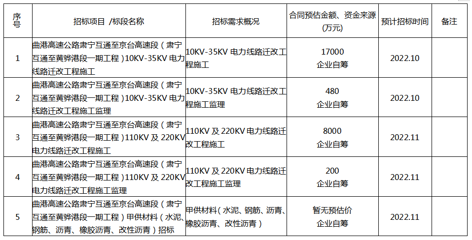 為便於投標人及時了解招標投標信息,根據《關於推動國有企業招標人落實提升招標投標活動質量若幹措施工作的通知》 (滄審批字(2021)19號)等有關規定,現將滄州曲港高速公路建設有限責任公司 2022年新增項目招標計劃公開如下: