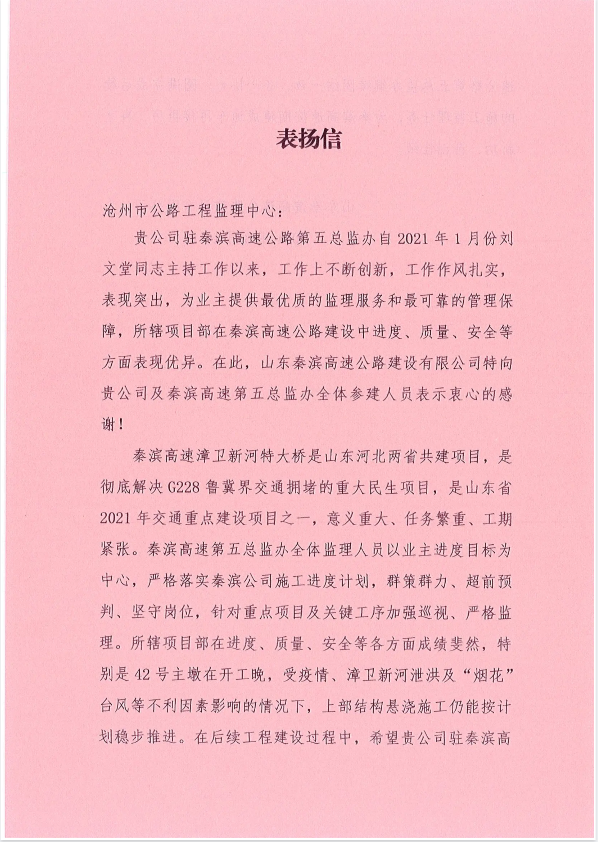 監理中心穩步推進秦濱高速漳衛新河建設項目,獲秦濱高速建設有限公司感謝表揚