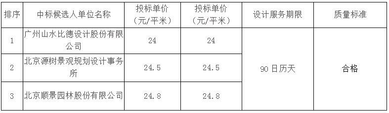 全部投標單位:北京源樹景觀規劃設計事務所、北京順景園林股份有限公司、廣州山水比德設計股份有限公司