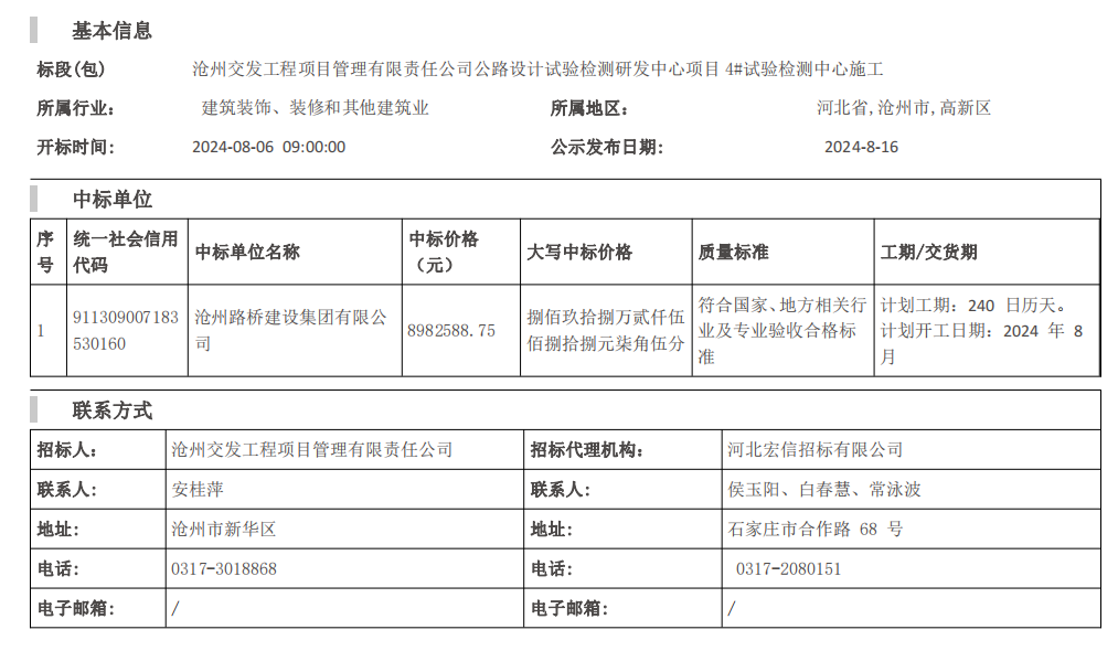 滄州交發工程項目管理有限責任公司公路設計試驗檢測研發中心項目 4#試驗檢測 中心施工中標結果公示