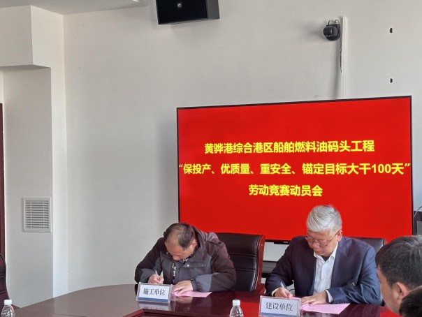 隨著“大幹100天”的號令吹響,滄州渤海新區港坤船舶燃料有限公司統籌項目建設質量和建設效率,全力以赴、拿出百分之百幹勁,紮實推進黃驊港綜合港區船舶燃料油碼頭項目建設,2月26日組織召開“保投產、優質量、重安全、錨定目標大幹100天”勞動競賽動員會。森旭公司、港坤船舶燃料公司董事長鮑衛國,公司其他班子成員及參建單位主要負責人參會。