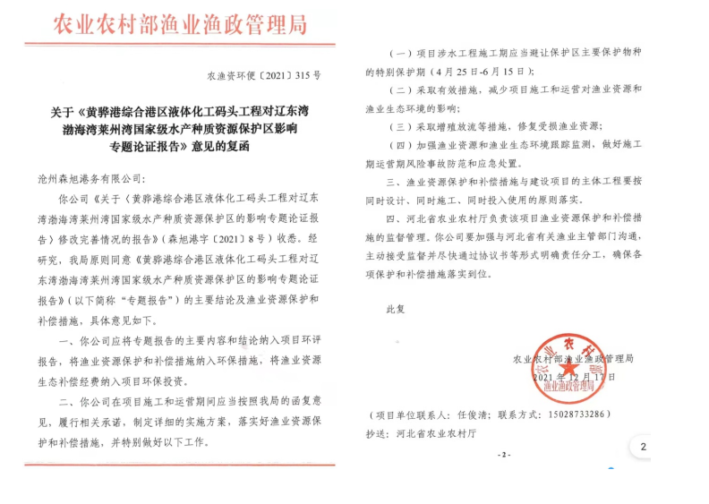 近日,《黃驊港綜合港區液體化工碼頭工程對遼東灣渤海灣萊州灣國家級水產種質資源保護區影響專題論證報告》取qu得de了le農nong業ye農nong村cun部bu的de批pi複fu。農nong業ye農nong村cun部bu批pi複fu的de取qu得de加jia快kuai了le液ye體ti化hua工gong碼ma頭tou工gong程cheng項xiang目mu前qian期qi手shou續xu跑pao辦ban的de進jin度du,為wei項xiang目mu開kai工gong建jian設she奠dian定ding了le堅jian實shi基ji礎chu。