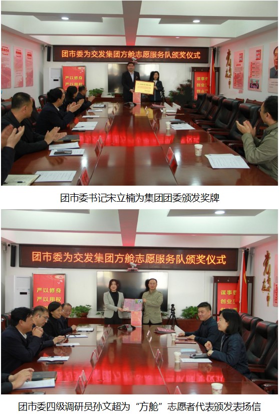 4月6日,團市委書記宋立楠、團市委四級調研員孫文超、團市委誌工部部長沈鵬蒞臨交發集團,召開誌願服務表彰會,為交發集團團委頒發了“2022年疫情防控誌願服務突出貢獻獎”獎牌和對集團公司的感謝信,為奮戰在方艙核檢一線的30名誌願者頒發了表揚信。