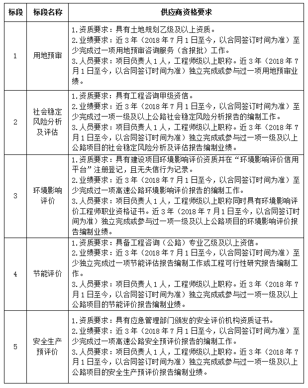 (三)標段劃分:5個標段,1標段用地預審、2標段社會穩定風險分析及評估、3標段環境影響評價報告、4標段節能評價、5標段安全生產預評價。