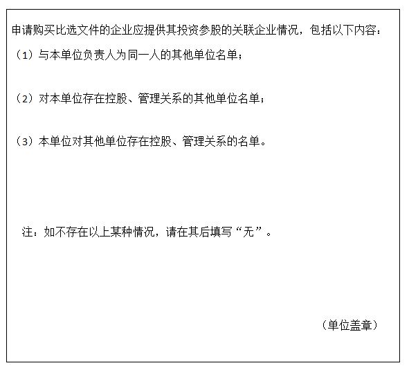 方式:有意向的供應商在比選文件發售時間內,由法定代表人或授權代理人持營業執照複印件(加蓋公章)、資質證書複印件(加蓋公章)、投資參股的關聯企業情況表原件(格式見附件)、購買人的身份證原件、授權委托書(法定代表人親自購買文件的無需授權委托書)原件,到指定地點報名並購買比選文件。