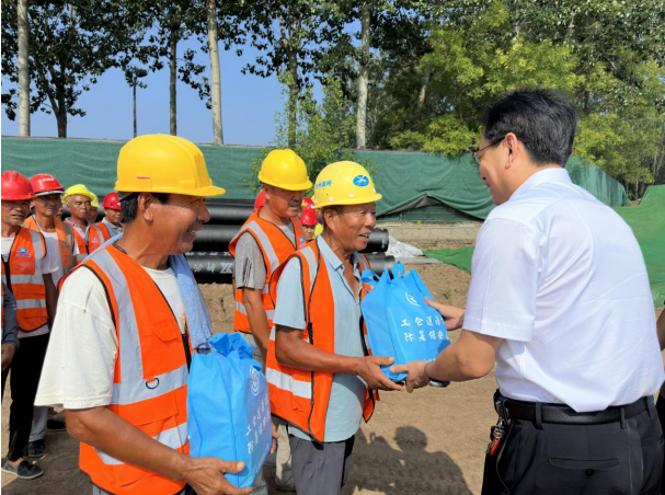 8月6日上午,滄州市總工會黨組成員、經jing審shen委wei主zhu任ren王wang增zeng光guang,滄cang州zhou市shi總zong工gong會hui法fa工gong部bu部bu長chang陳chen磊lei一yi行xing來lai到dao城cheng鄉xiang公gong司si守shou真zhen路lu施shi工gong現xian場chang走zou訪fang慰wei問wen,為wei在zai炎yan炎yan夏xia日ri中zhong堅jian守shou崗gang位wei的de一yi線xian工gong人ren送song去qu防fang暑shu降jiang溫wen物wu品pin,把ba關guan心xin關guan懷huai送song到dao廣guang大da工gong人ren的de心xin坎kan上shang。集ji團tuan黨dang委wei副fu書shu記ji、工會主席楊鴻博,集團黨委辦公室負責人王健陪同。